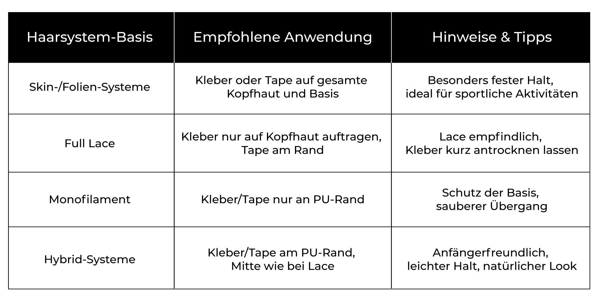 - Welcher Haarsystem-Kleber oder welches Haarsystem-Tape zu deiner Kopfhaut und deinem Lebensstil passt.